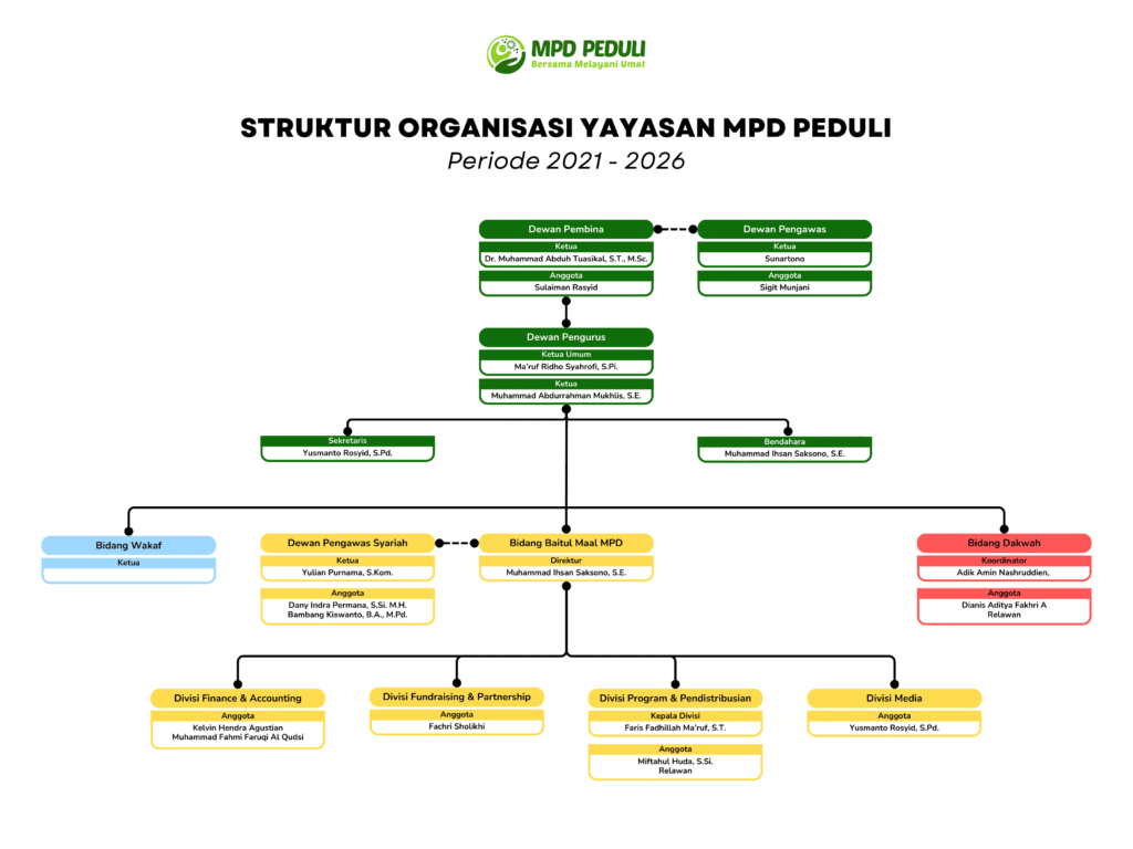 Struktur organisasi Yayasan Masjid Pogung Dalangan Peduli (MPD Peduli) dibentuk untuk memastikan tata kelola lembaga berjalan efektif, transparan, dan sesuai dengan prinsip syariah. Setiap unsur dalam struktur memiliki peran strategis sesuai dengan fungsi dan tanggung jawabnya masing-masing.